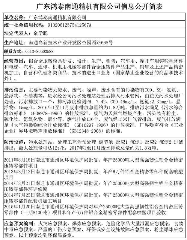 廣東鴻泰南通精機有限公司環(huán)保信息公開簡表