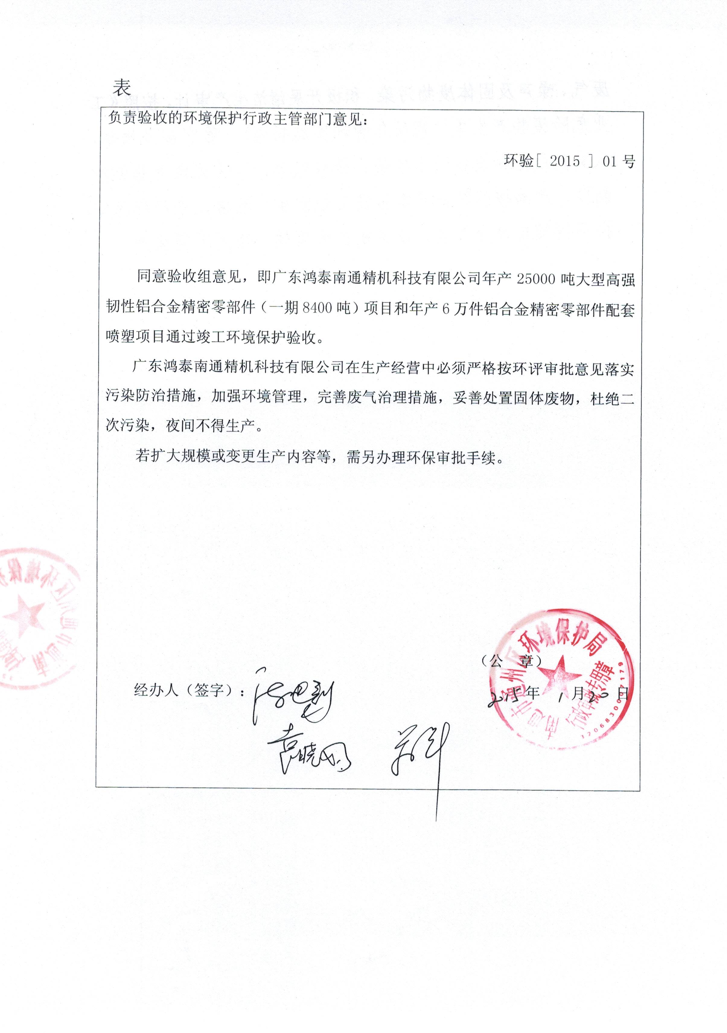 2015年1月20日通州區(qū)環(huán)保局同意驗收組意見,廣東鴻泰一期項目(年產(chǎn)8400噸大型高強(qiáng)韌性鋁合金精密零部件和年產(chǎn)6萬件鋁合金精密零部件配套噴塑項目)通過竣工環(huán)境保護(hù)驗收,我公司將按照規(guī)定合法合規(guī)操作,加強(qiáng)環(huán)境保護(hù)。